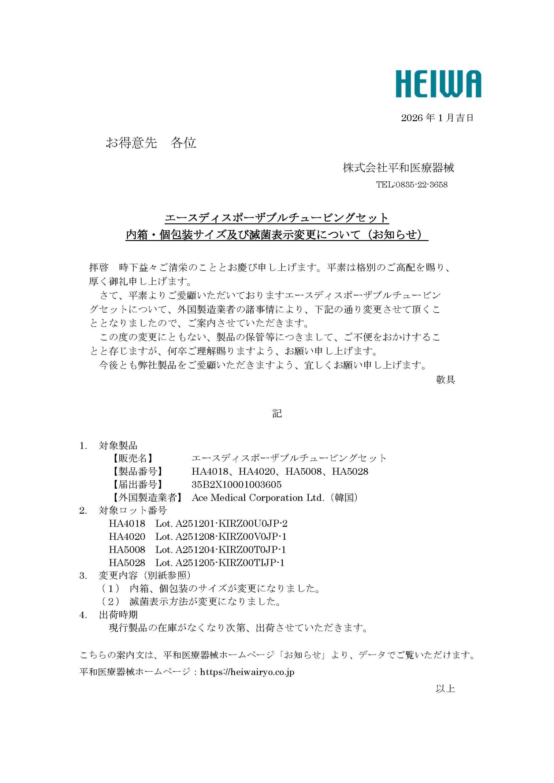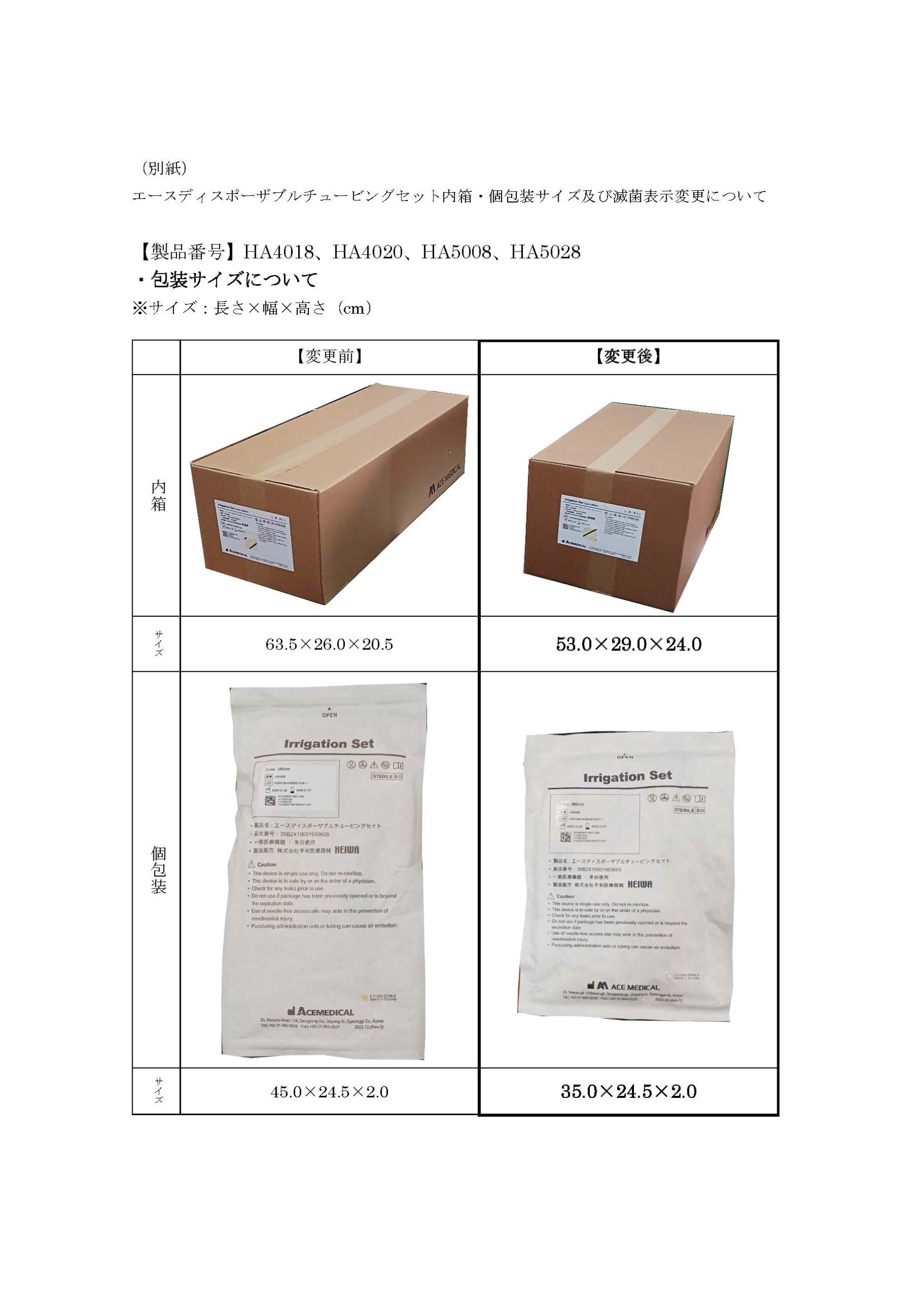 Ace Medical社エースディスポーザブルチュービングセット包装・滅菌表示 仕様変更のお知らせ