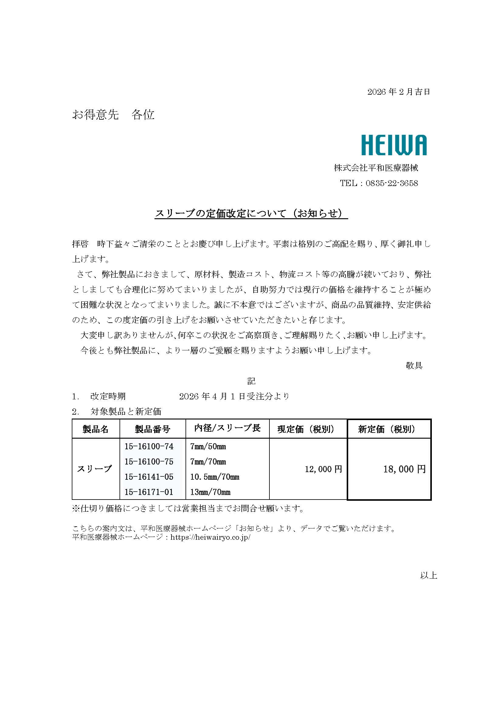 スリーブ 定価変更のお知らせ