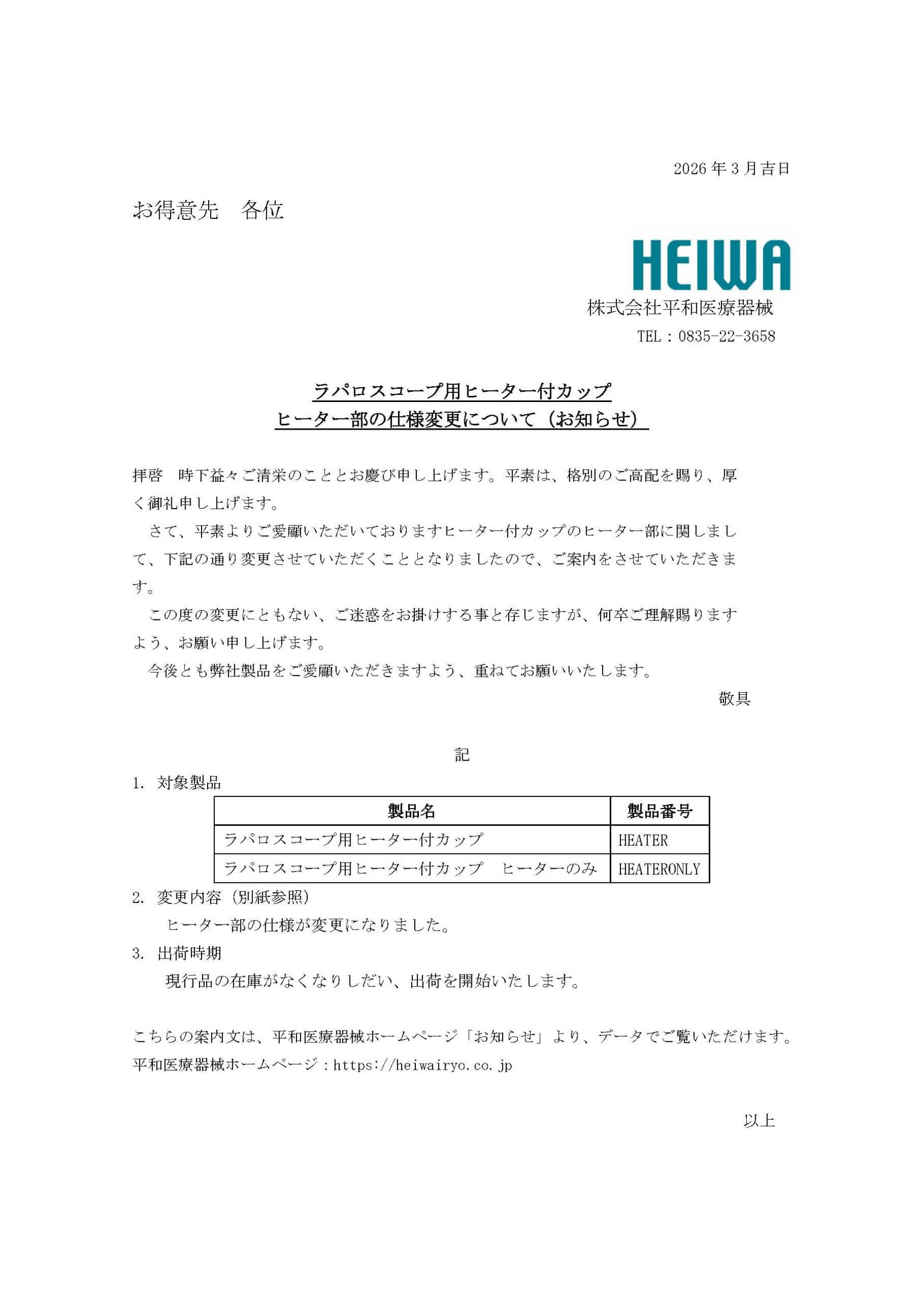 ラパロスコープ用ヒーター付カップ ヒーター部仕様変更についてのお知らせ